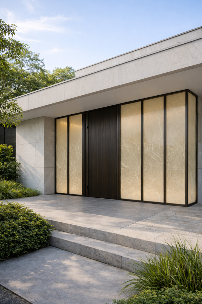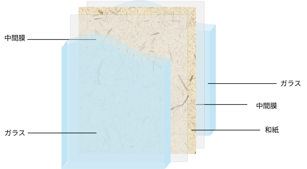 和紙ガラスは、合わせガラスの間に和紙を挟んだデザイン性の高いガラスです。和紙ならではの風合いや質感から、ひと味違う透け感を生み出します。和紙ガラスに使用される和紙には、さまざまな種類・色があり、その印象は大きく異なります。